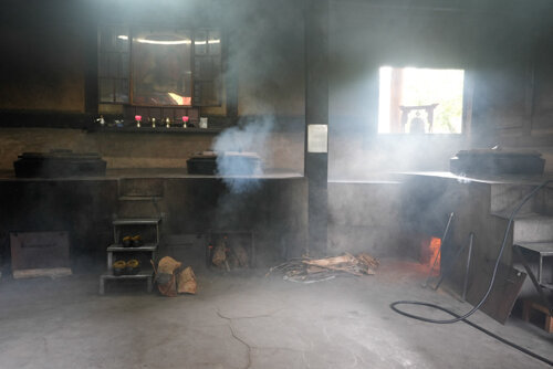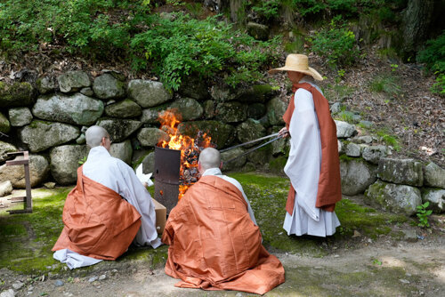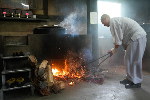 Burning of wood to cook rice on a caldron during the Lotus Sutra recitation ceremony