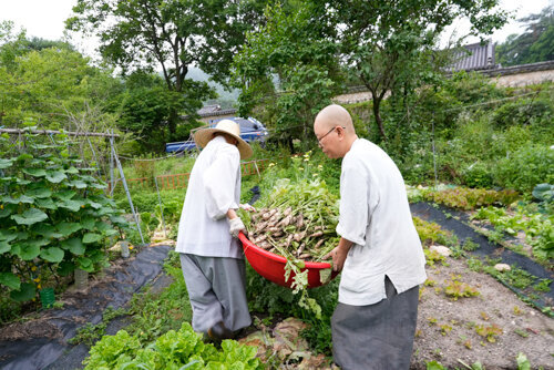Two Buddhist nuns harvesting radishes at Young Ji Sa Temple